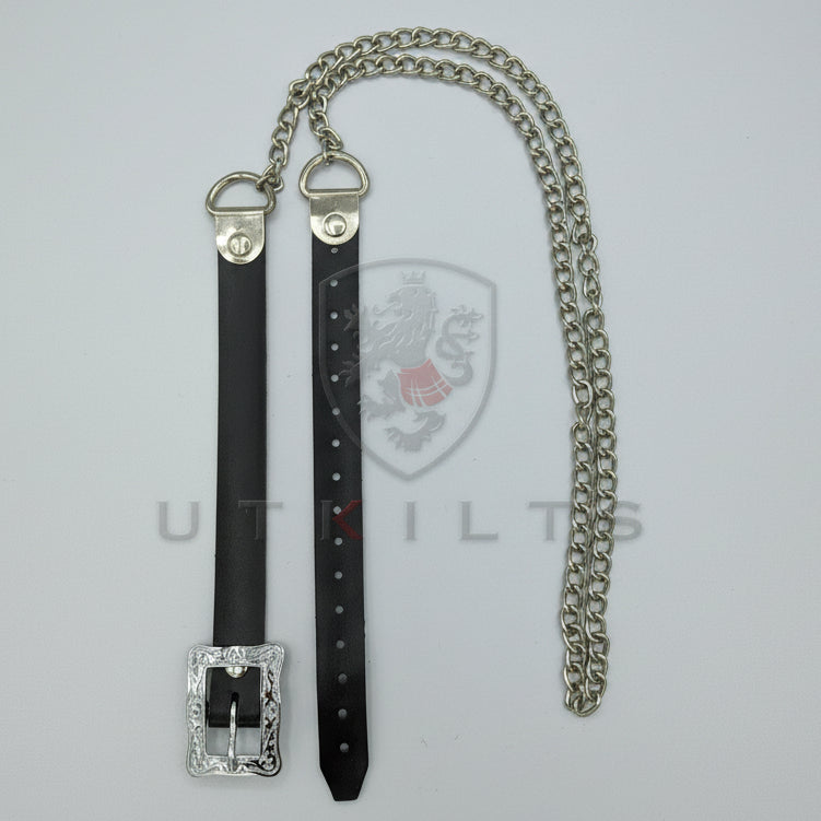 The Inverloch sporran chain strap is an upgraded version of the traditional style, created to deliver a polished, formal finish for your kilt outfit. This single-piece chain attaches to a black faux leather strap with a decorative buckle, giving it a clean, high-quality appearance that's perfect for weddings, Highland festivals, or any event where you want to stand out. It's a dependable upgrade for anyone wanting to add more style and quality to their gear. Built with durable materials, it offers lasting performance while completing your outfit with true Highland character.